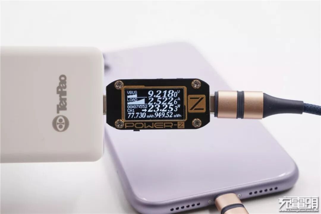 充iPhone 11,电压9.21V,电流2.52A,功率23.25W,顺利握手PD快充。