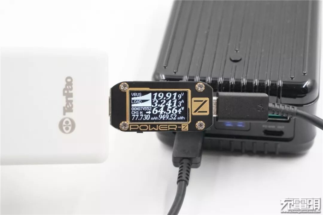 充100W移动电源,电压19.91V,电流3.24A,功率64.56W,顺利握手PD快充,达到充电器最大输出功率。