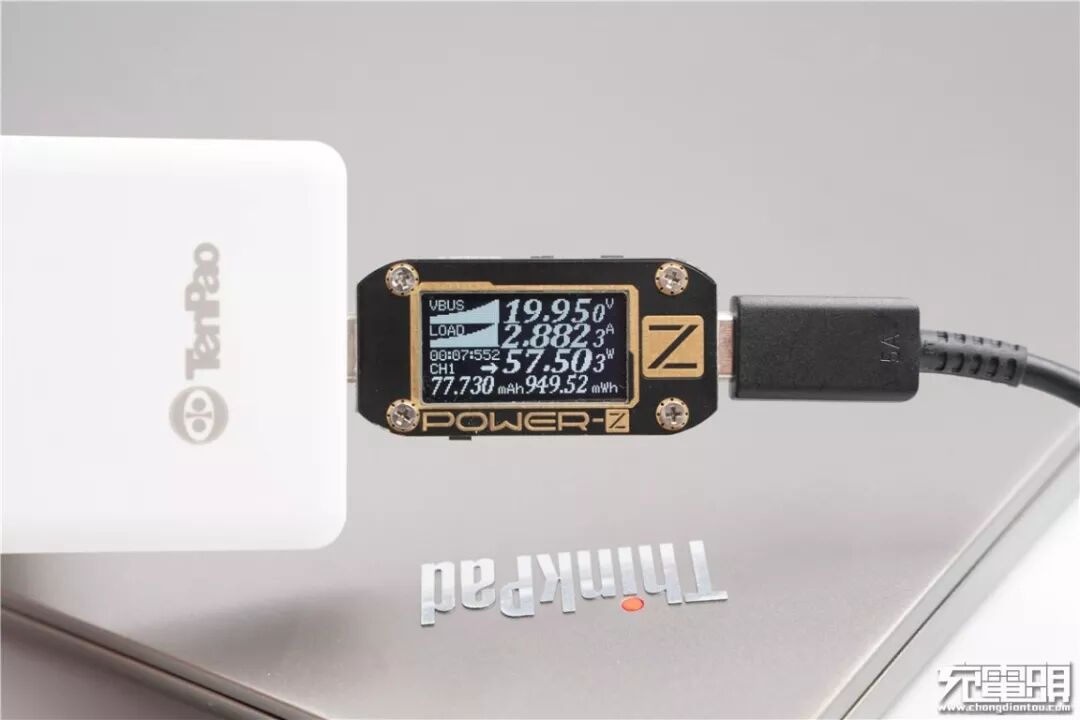 充ThinkPad S3,电压19.95V,电流2.88A,功率57.50W,顺利握手PD快充。