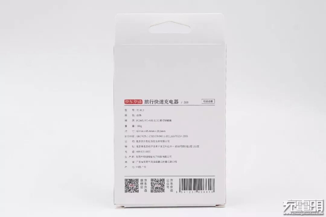 京东京造63W充电器的包装盒比较大,白色纸盒简约包装,左上角印有京东京造旅行快速充电器字样,下方有充电器实物图以及京造英文 “J.ZAO” LOGO。