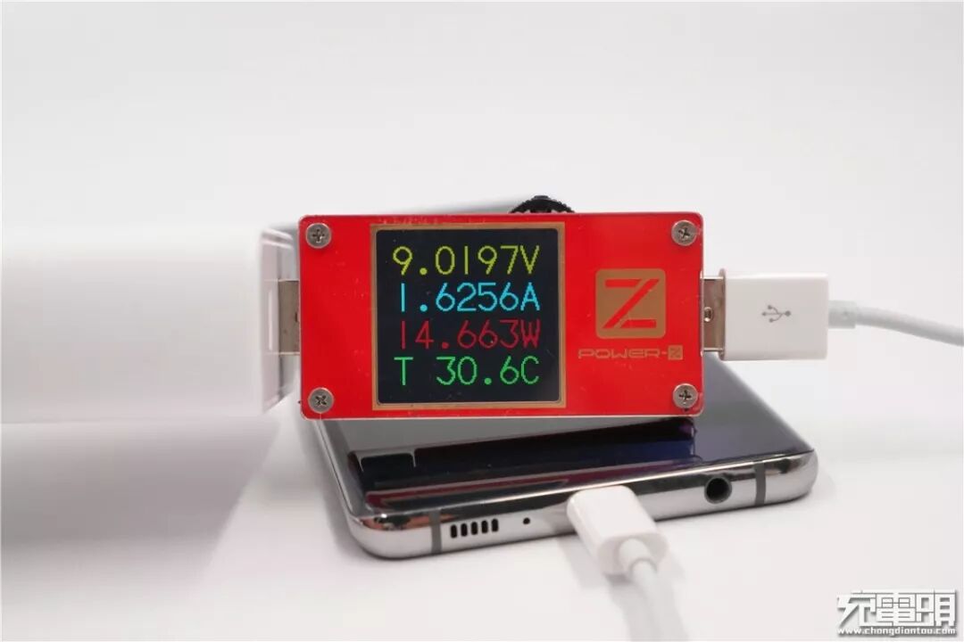 充三星S10+,电压为9.06V,电流为1.62A,功率为14.70W,顺利握手USB PD快充。