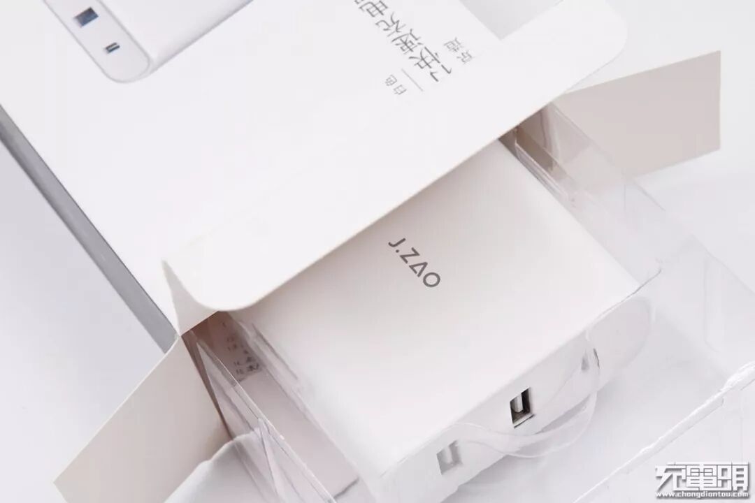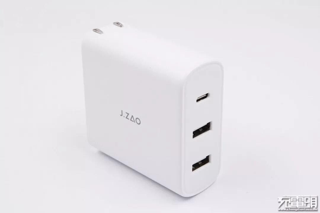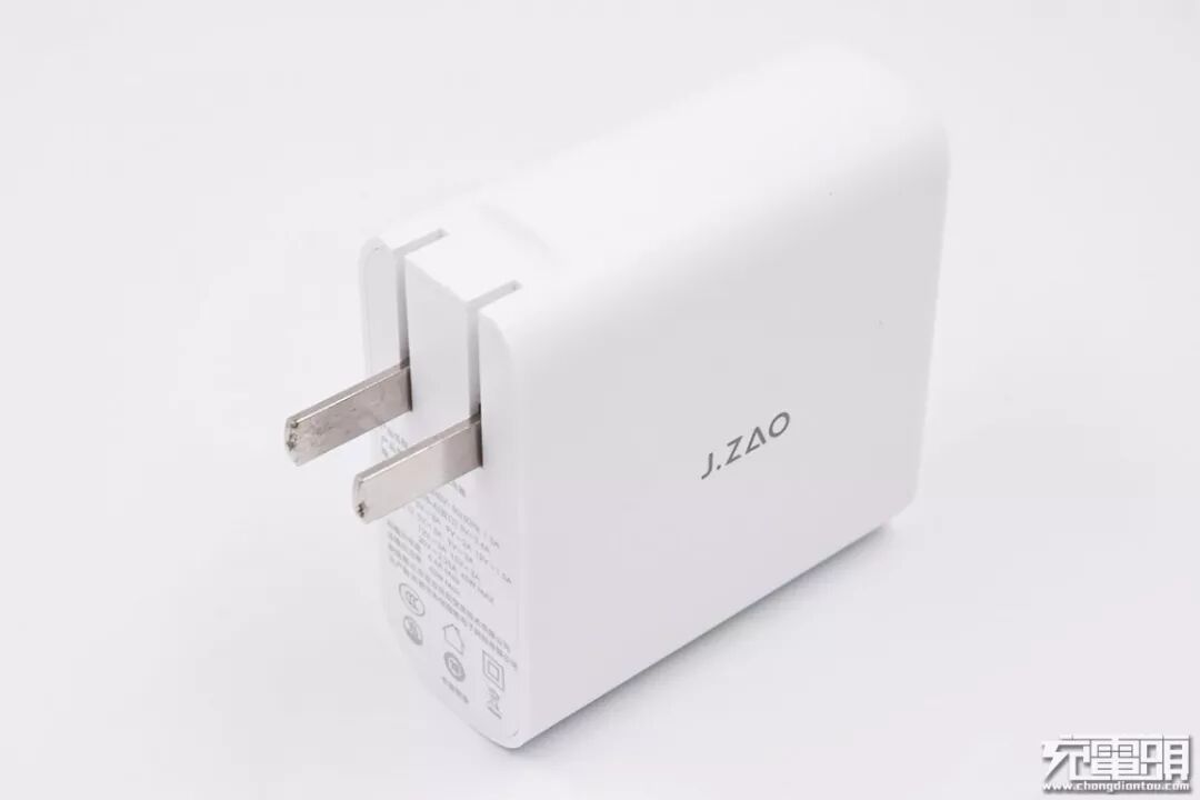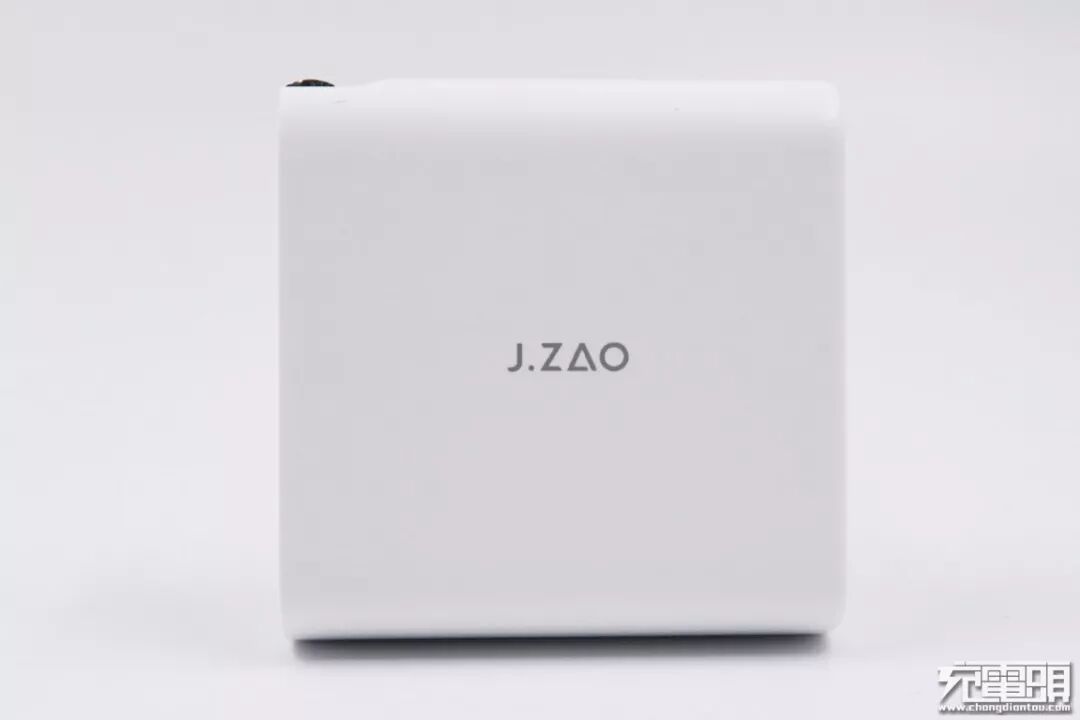 京造63W充电器有黑白两种颜色款式,小编买的是白色版本。这款充电器使用阻燃塑料外壳,表面有涂层,手感细腻,充电器中央丝印银灰色“J.ZAO“字母LOGO。