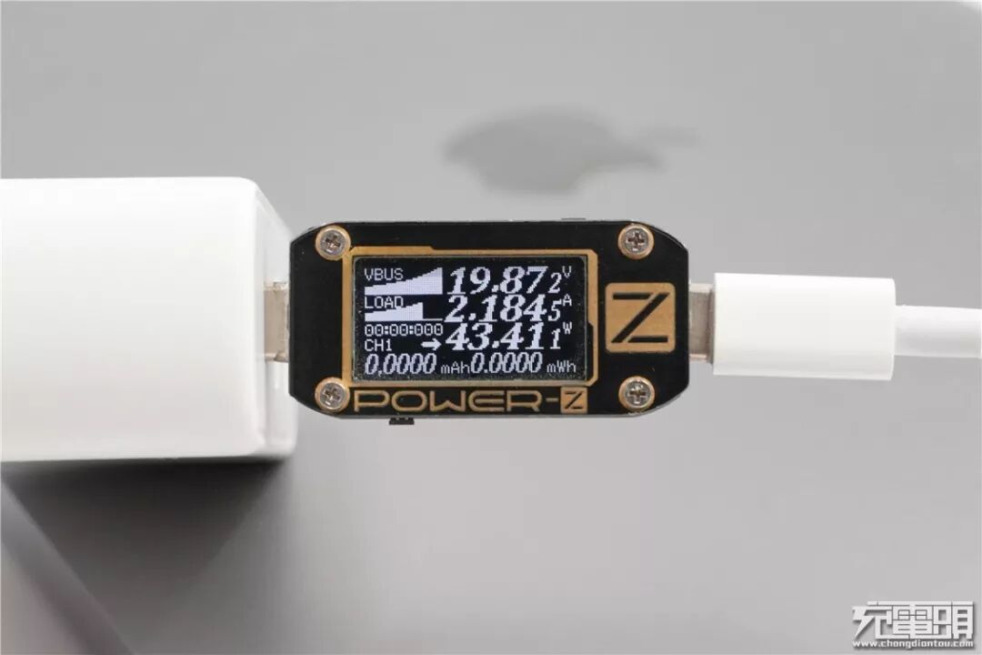 充MacBook Pro 13,电压为19.87V,电流为2.18A,功率为43.41W,顺利握手USB PD快充。
