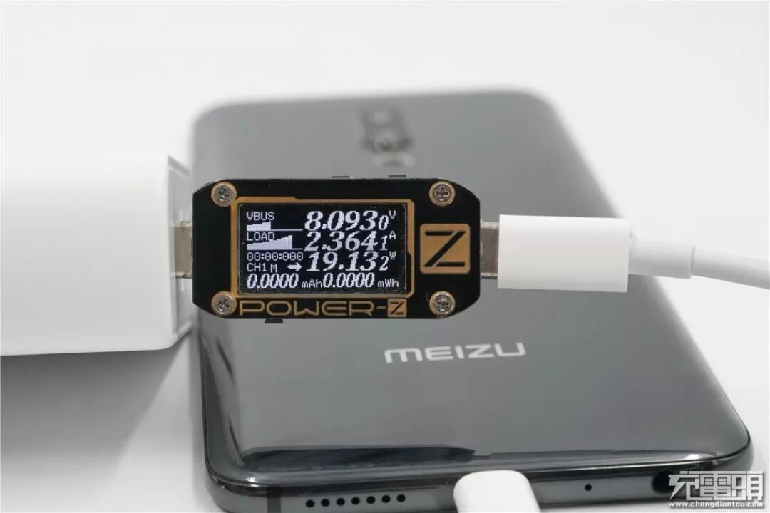 充魅族16th Plus,电压为8.09V,电流为2.36A,功率为19.13W,顺利握手PE快充。