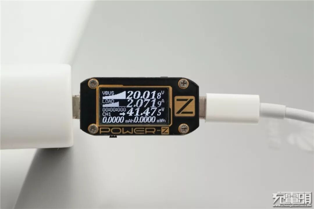 充MateBook Pro 13,电压为20.01V,电流为2.07A,功率为41.47W,顺利握手USB PD快充。