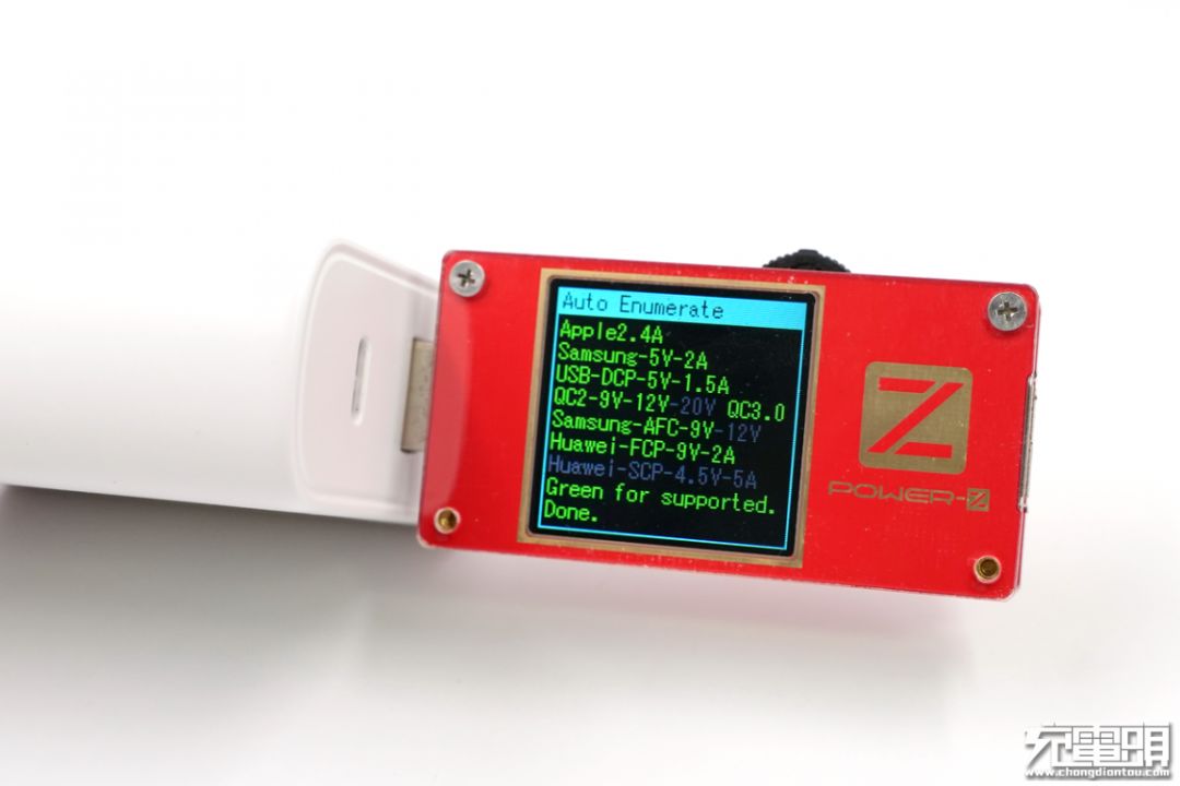 使用ChargerLab KT001测得USB-C口支持Apple 2.4A、QC 2.0、QC 3.0、FCP、SCP、AFC等协议,协议检测全绿。