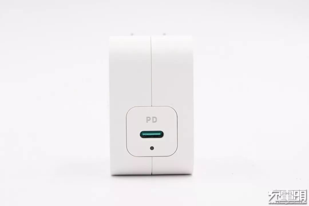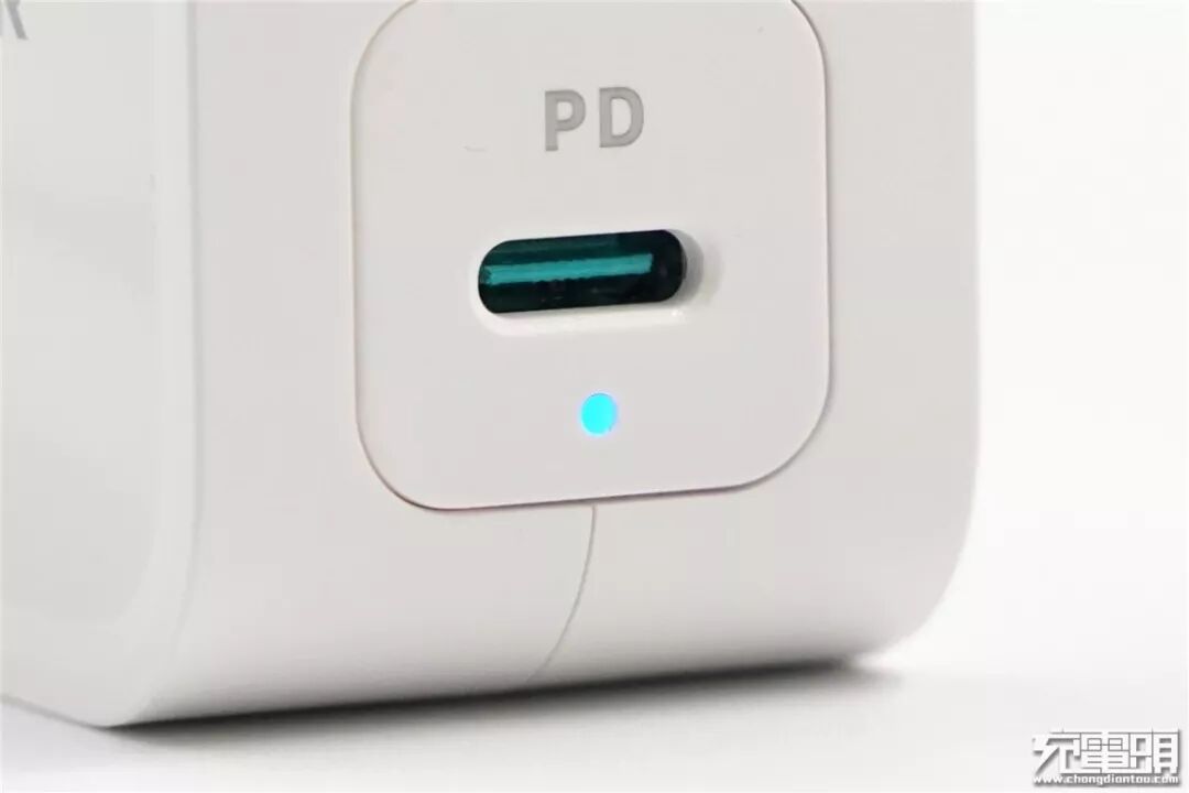 充电器为单USB-C口设计,蓝色舌片。USB-C口上方丝印“PD”字样,下方有一枚指示灯.