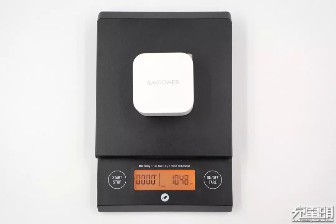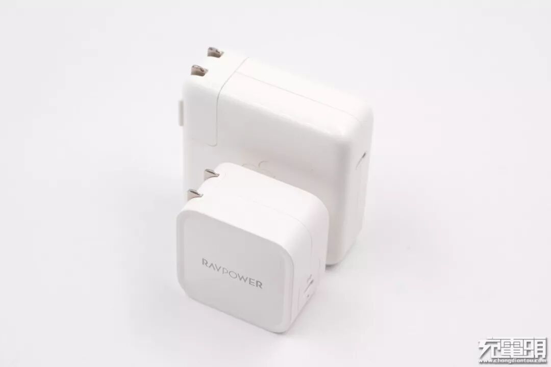 与苹果61W充电器大小对比,RAVPower 61W GaN 氮化镓充电器在体积上有着巨大的优势。