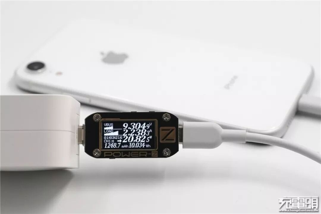 使用RAVPowe 61W GaN 氮化镓充电器充iPhone XR,电压9.3V,电流2.23A,功率20.82W,开启PD快充。