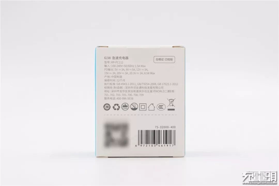 包装盒背面有着RAVPower 61W GaN 氮化镓充电器的相关参数信息。