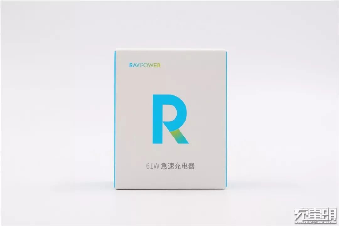 RAVPower是一家知名的跨境电商品牌,主营消费类电源配件,在美国市场拥有很高的知名度。RAVPower 61W GaN 氮化镓充电器的包装盒设计十分简洁,正面一个超大的“R”字突显起品牌辨识力,“R”字下方有着“61W极速充电器”字样。