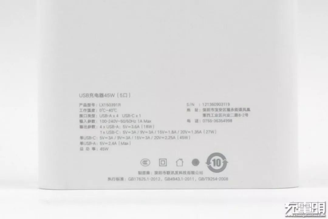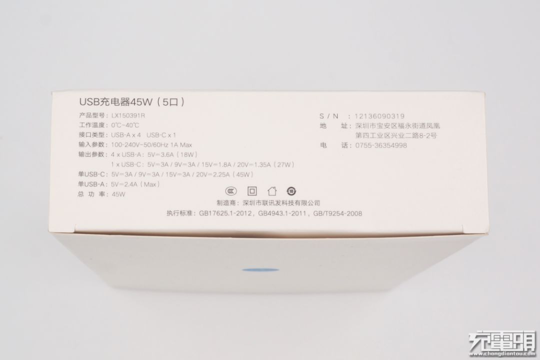 再来看盒子的一侧,制造商为深圳市连讯发科技有限公司,上面标注着充电器的规格,这个我们稍后再看。