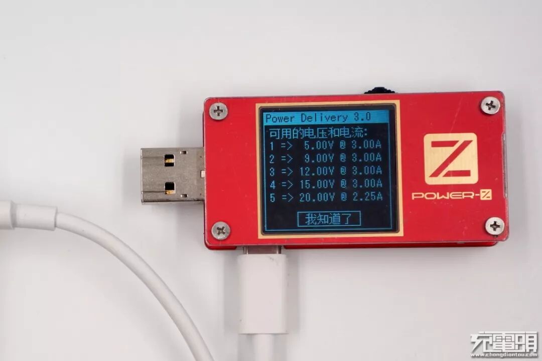 由chargerlab的Power-Z KT001的IPO报文显示C口支持的PD快充档位为:5V3A、9V3A、12V3A、15V3A、20V2.25A。比充电器壳体上标注的多了一个12V3A档位的选择。
