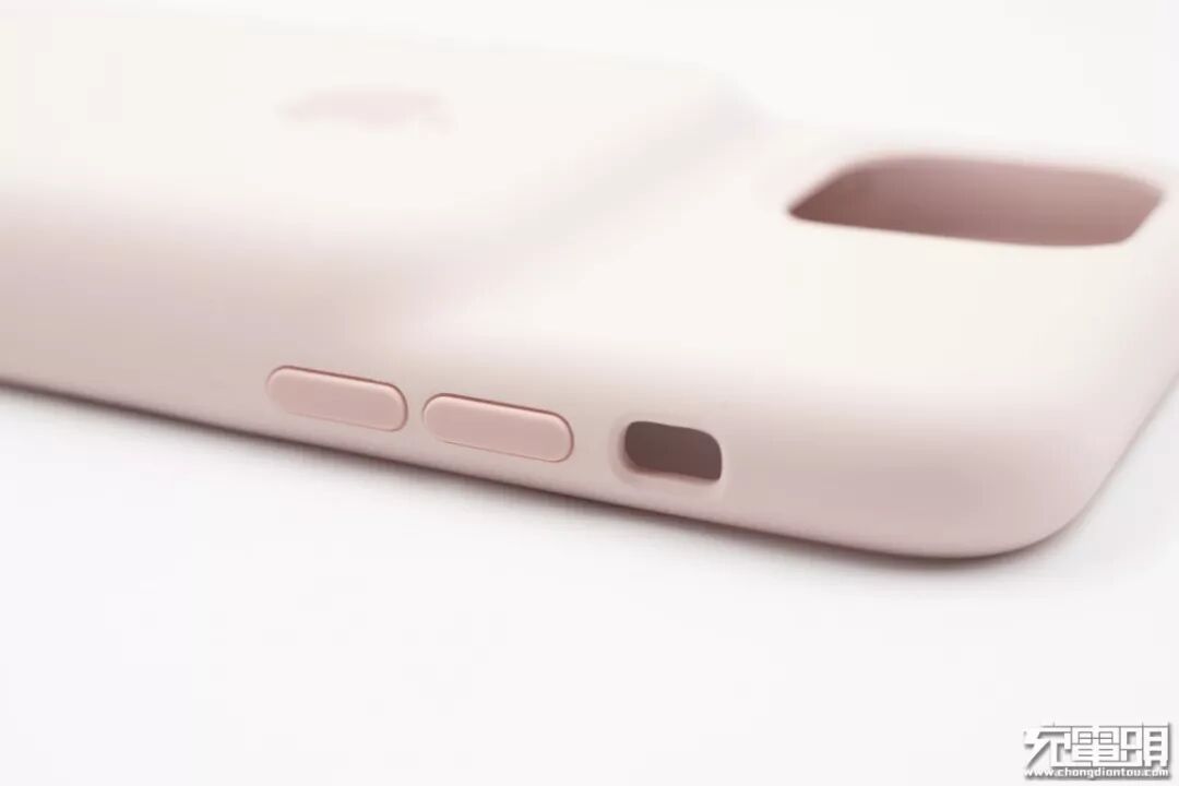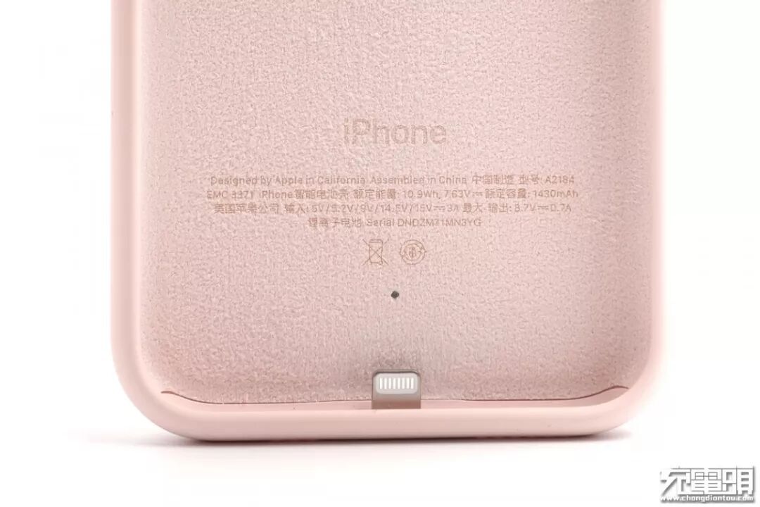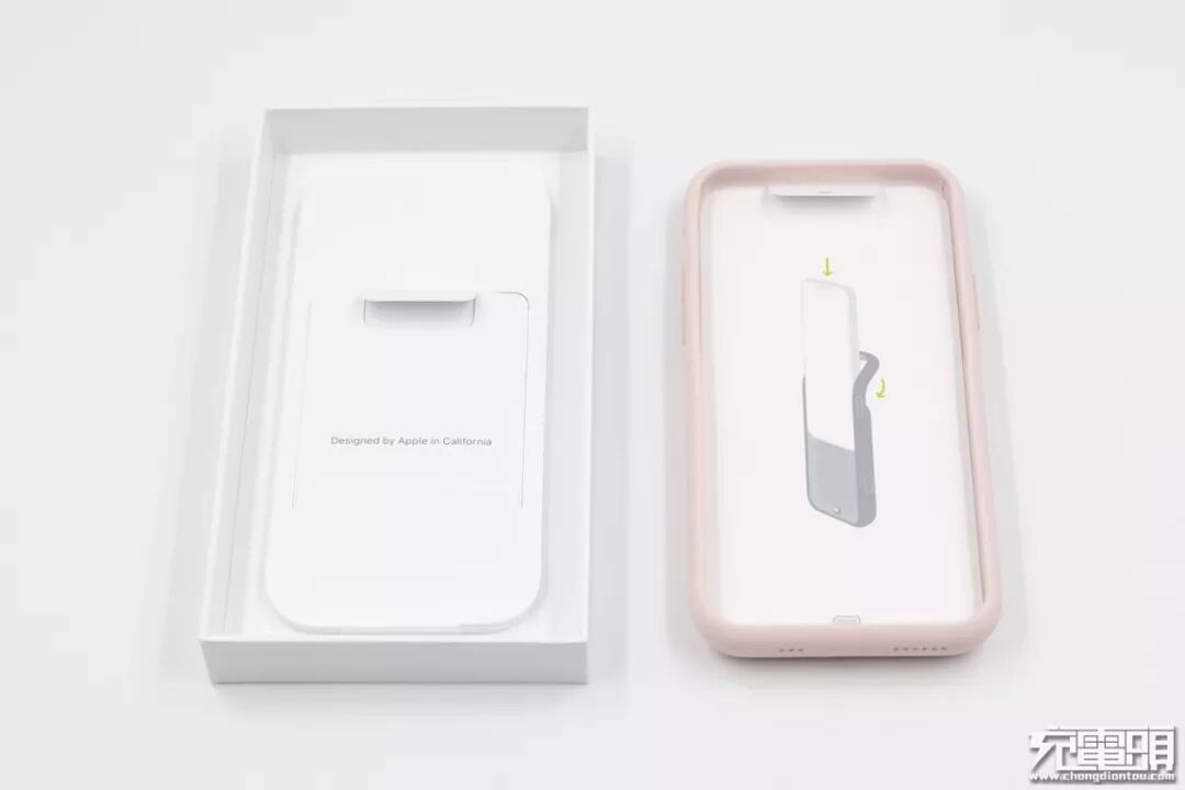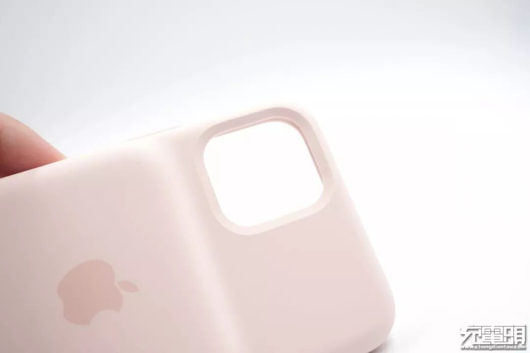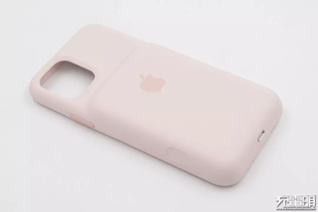 接下来我们就来看看今天的主角,iPhone 11 Pro Smart Battery Case ,整体以粉色呈现出来,上面摄像头的开孔部分,下面大块突出部分就是电池所在处,上面印制着苹果经典的Logo。