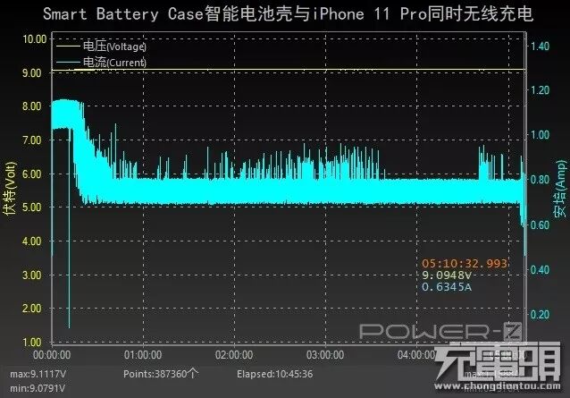 最后测试的是Smart Battery Case智能电池壳与iPhone 11 Pro同时无线充电,测试条件为使用苹果61W充电器(A1947)连接到Native Union立式无线充(DOCKWLT02)进行充电。前20分钟左右,功率为9.11V1.16A 10.56W 。之后温度上升,功率降至9.13V0.78A 7.12W。电压一直持稳定状态,电流变化幅度较小。电量从0~100%全程耗时约5小时10分。