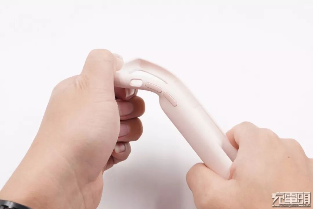 摄像头以下部分大面积凸起,这也是内置锂电池所在位置。外层使用硅胶面层,触感柔软顺滑,带来舒适手感。
