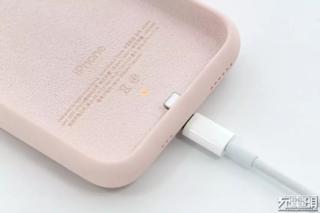 那么电池壳自身能否单独进行充电呢,我们测试了一下,插上数据线,超细纤维内衬里面的橙色电量指示灯亮起,电池壳脱离手机也可以单独进行有线充电。