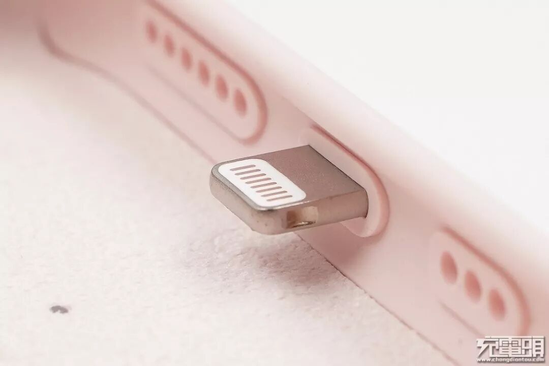 Lightning输入接头特写,端子触点为金色,底部Lightning接头固定不可晃动,扬声器孔、麦克风孔、Lightning公头底座都有突起的硅胶。