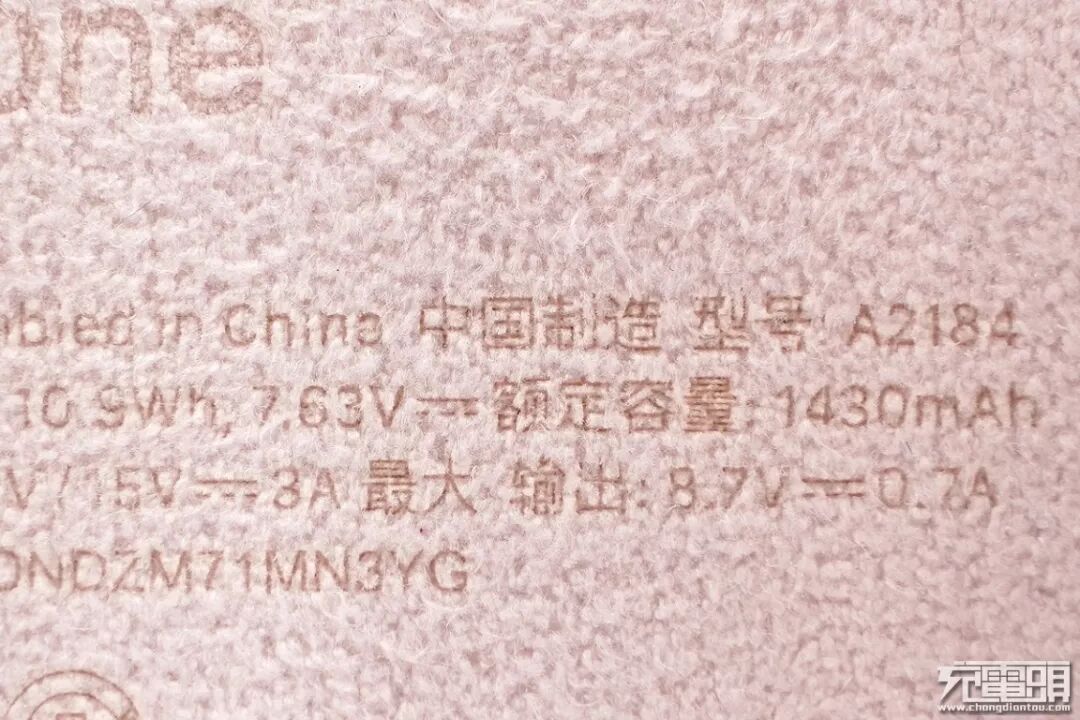 电池壳内部是一些电池壳型号等相关信息,Designed by Apple in california Assembled,由在加利福尼亚州的苹果公司设计,中国制造。型号:A2184,EMC3371,iPhone智能电池壳。额定能量:10.9Wh,7.63V,额定容量:1430mAh。美国苹果公司,输入:5V/5.2V/9V/14.5V/15V3A 最大,输出:8.7V0.7A。
