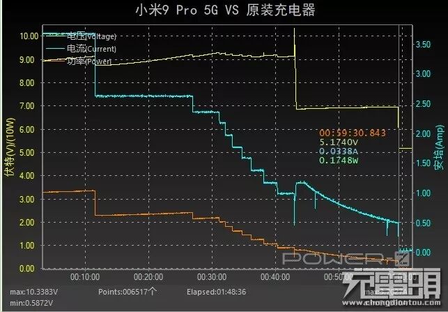 小米9 Pro 5G搭配原装40W充电器在充电的过程中电流随着电量上升呈下降状态,中途出现了多个功率平台,最高功率为9.11V3.68A 33.54W ,充电完成。电量0~100%全程耗时约59分 30秒。