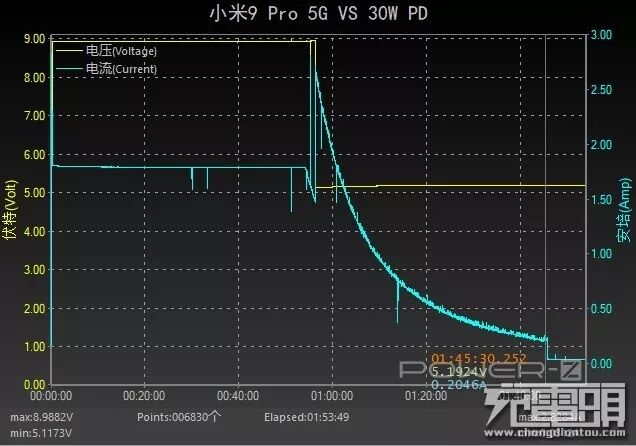 小米9 Pro 5G搭配PD充电器充电电流持平稳状态,在经历了短暂的高峰之后,随后功率降至1.45W, 此时充电完成。最高功率为8.93V1.79A 16W,电量0~100%耗时约1小时45分。