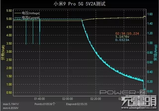 小米9 Pro 5G搭配5V2A充电器电流持平稳状态随后逐渐下降,最后功率降至2.54W,最高功率为4.88V1.48A 7.26W充电完成。全程耗时约2小时544分。