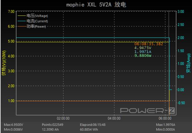 mophie XXL在输出的测试过程中,可以看到三种功率的输出趋势都很平稳,mophie经过了苹果官方认证,可见其内部对输出的控制还是非常不错的。