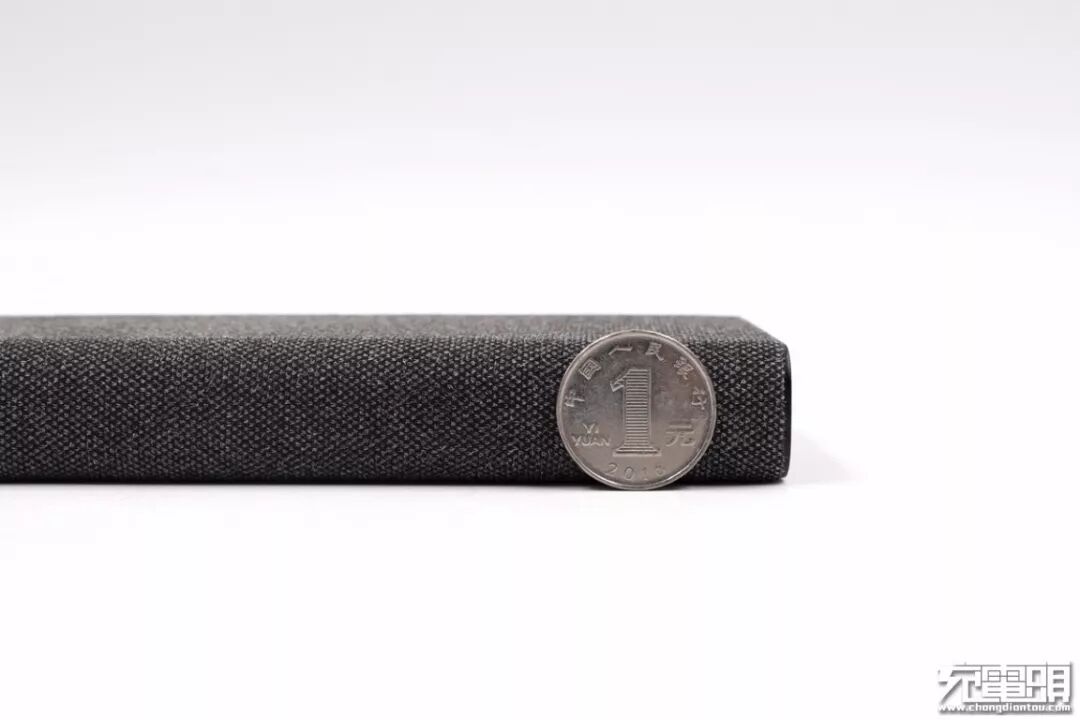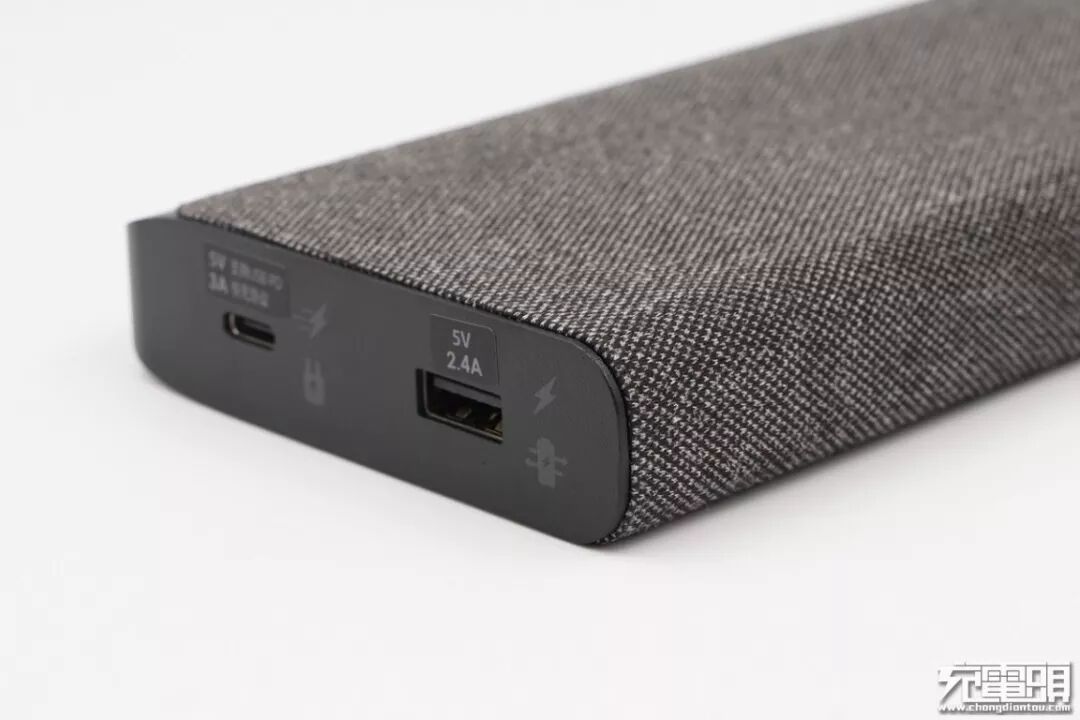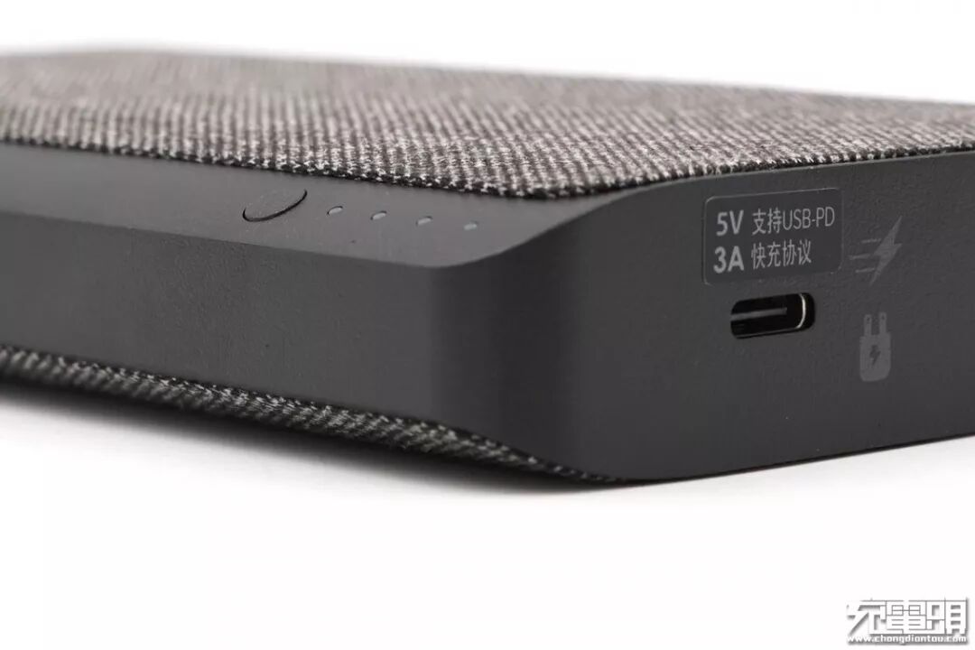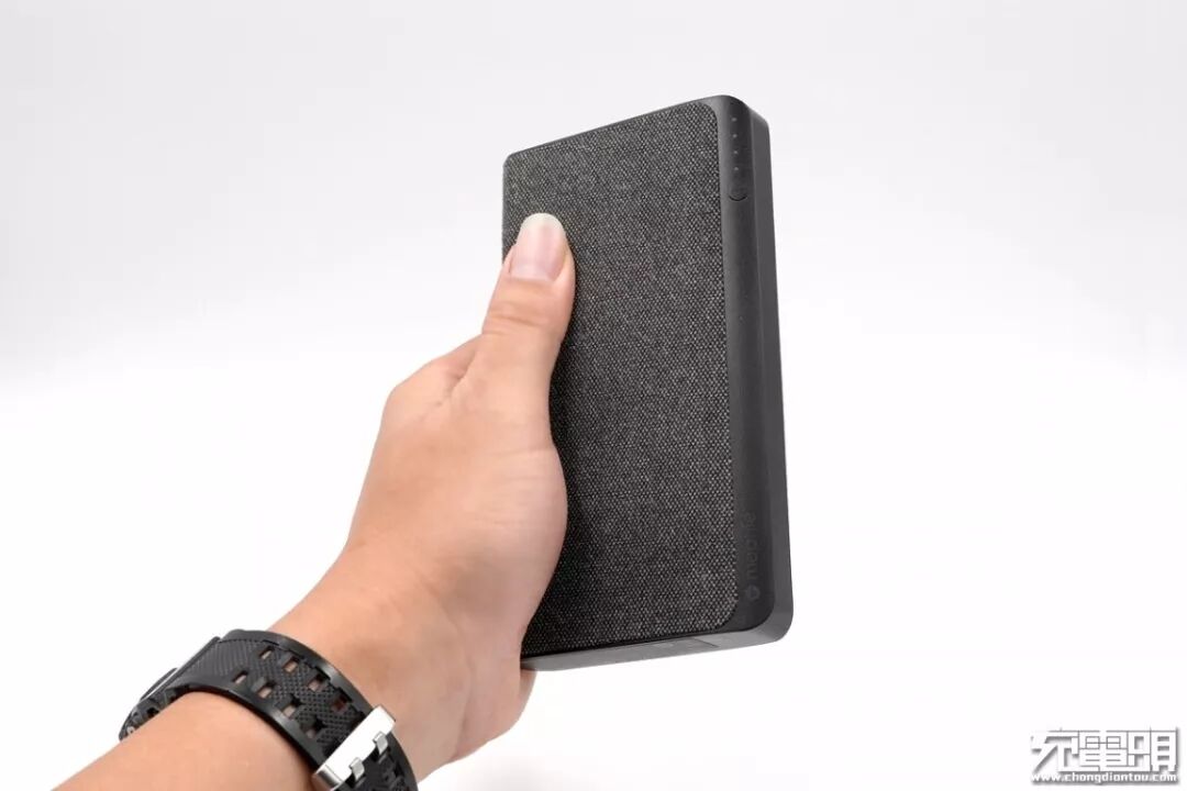拿出移动电源,布艺般的产品外壳设计,拿在手里感觉非常舒服,手感非常好。