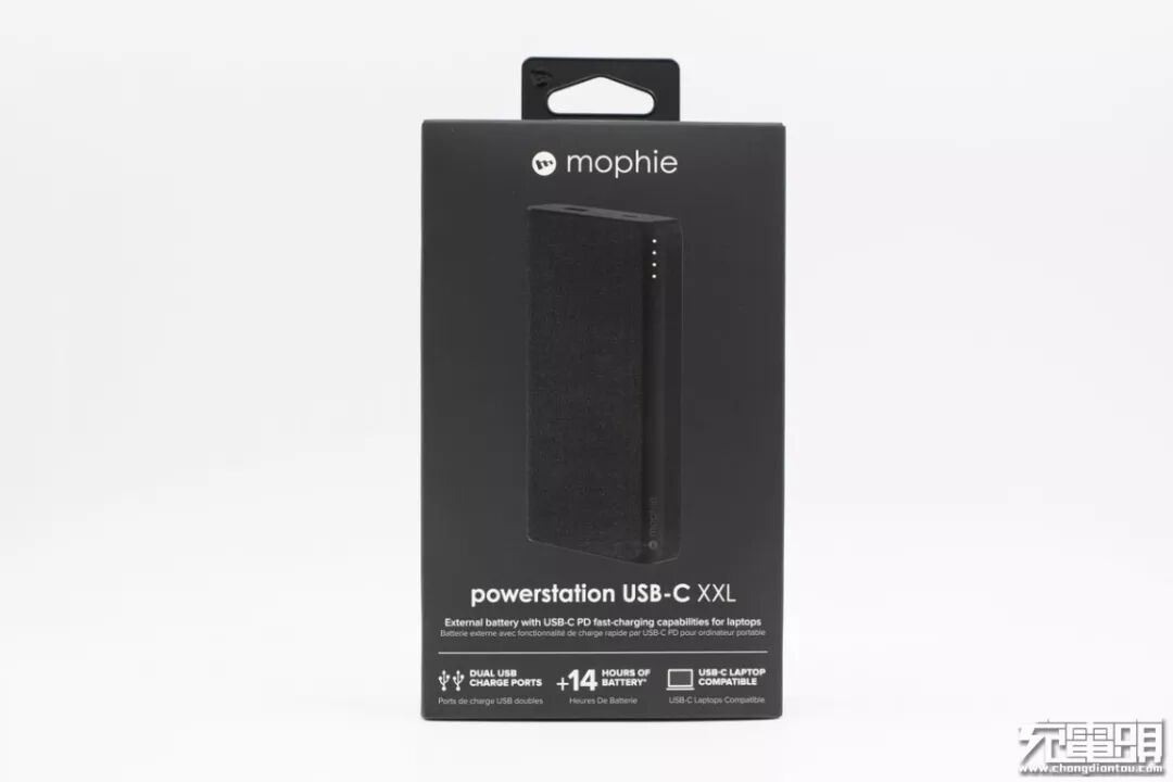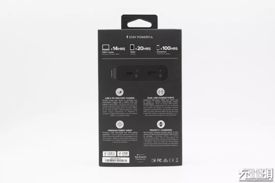 盒子的正面,依旧是mophie经典黑色外观包装,包装盒上面是“mophie”Logo ,中间是倾斜印制产品的照片,看上去有一种立体的感觉。下方为产品的型号,底部我们可以看到一些相关信息,具备双USB接口,可以延长电池14小时的使用时长,支持给笔记本电脑充电。