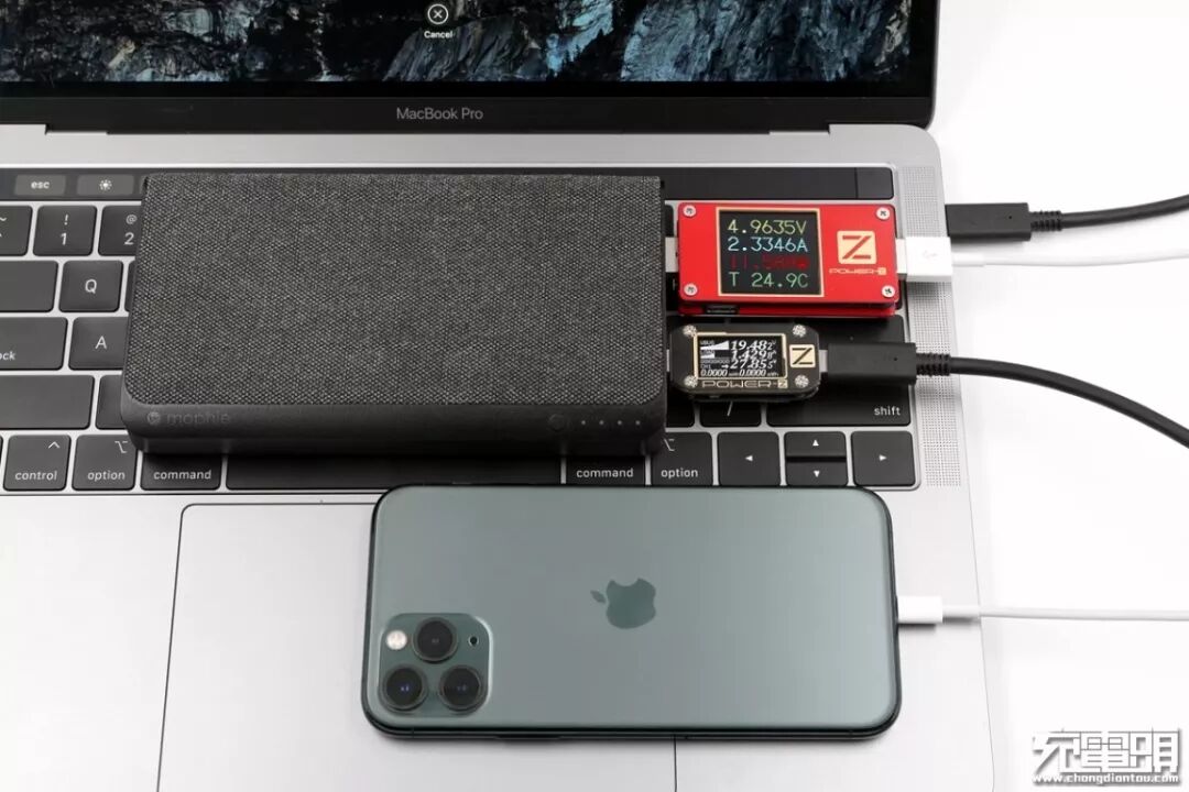 用USB-C接口输出MacBook Pro13,用USB-A输出iPhone 11 Pro,可以看到USB-C输出功率为27.85W ,开启PD快充,USB-A输出功率为11.58W,开启Apple2.4A快充。在双口同时进行输出的时候,互不影响。