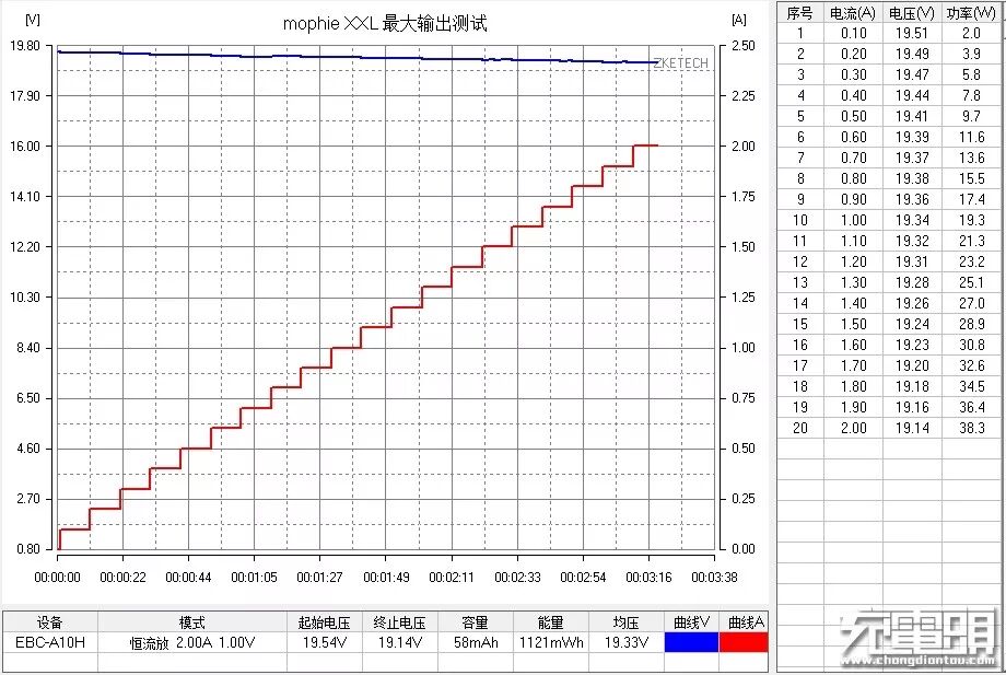 mophie XXL参数标识上宣称最大输出功率为30W,但是在实际测试中得到的数据可以看出,移动电源的最大输出功率可以达到38.3W ,超出宣称的30W最大输出功率。