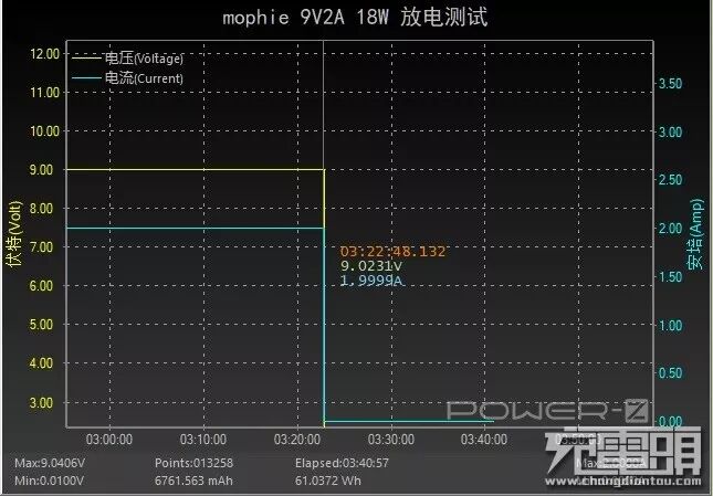 设定放电功率为9V2A 18W的输出功率进行测试,全程耗时3小时22分,电流电压一直保持稳定状态。输出的能量为61.037Wh,由此得出结论,移动电源在以9V2A 18W的功率进行输出时,效率约为61.037/70.785=86.22%