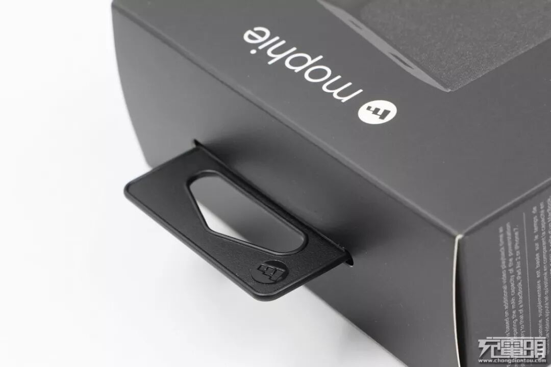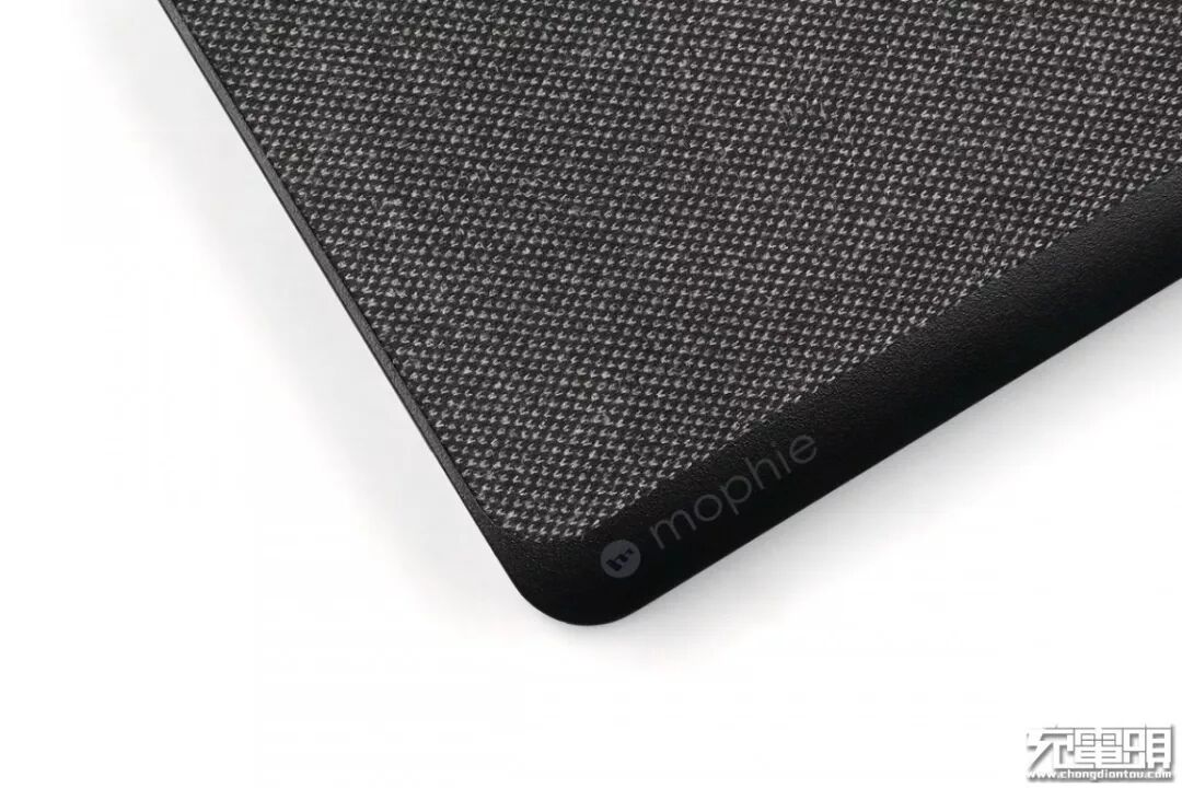 楔形的一侧,印制着“mophie”的Logo标识,产品的四周被布艺包裹,可以防止划伤和产品一起放入背包的其他物品。