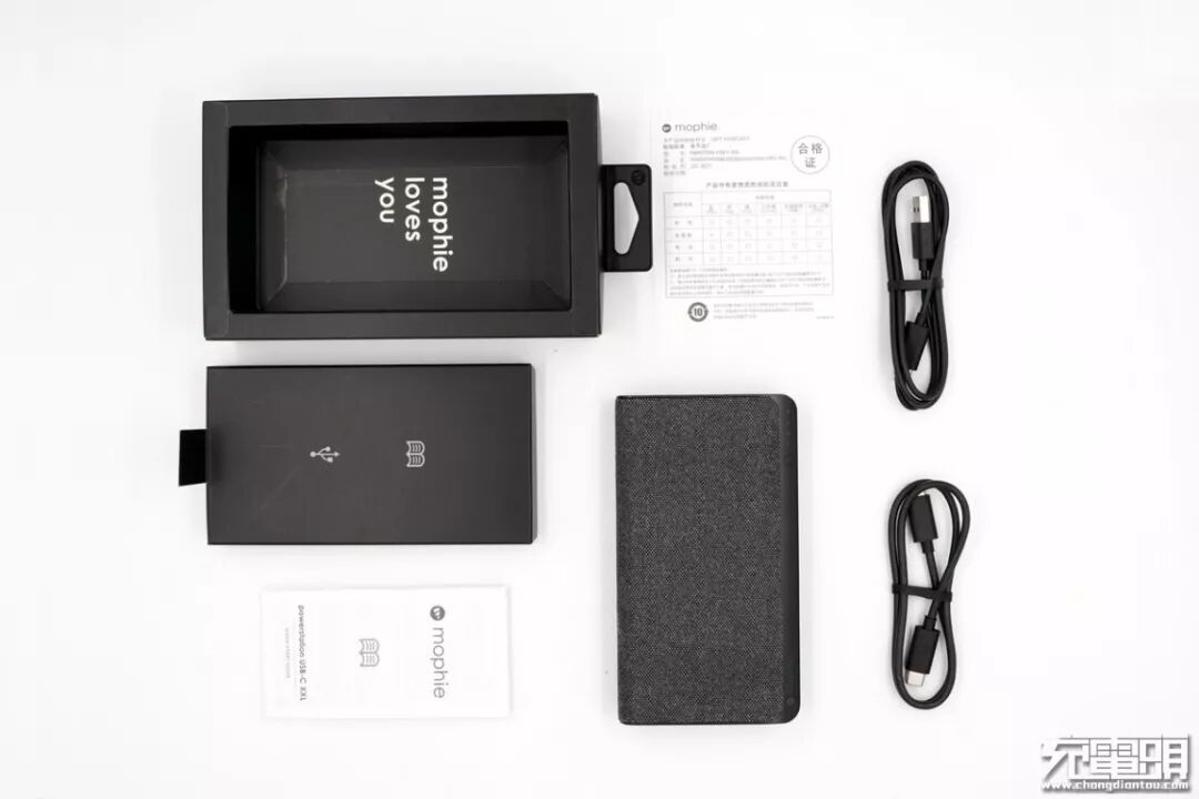 包装盒内附带USB-C to USB-C和USB-A to USB-C 两根数据线,上面均带有mophie的经典标识。