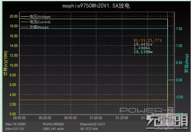 设定放电功率为20V1.5A 30W的功率进行输出,全程耗时1小时55分,移动电源放出的能量为56.157Wh。由此我们可以得出结论,移动电源在以20V1.5A 30W的功率进行输出时,效率约为56.157/70.785=79.33%。