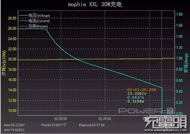 在对移动电源进行充电测试的时候,测试条件为苹果61W充电器,可以看到电压相对平稳,电流随时间呈下降趋势,最终在2小时57分的时候功率降到最低,此时充电完成。0~100%耗时约2小时57分,充电最高功率为19.86V1.53A 30.46W。