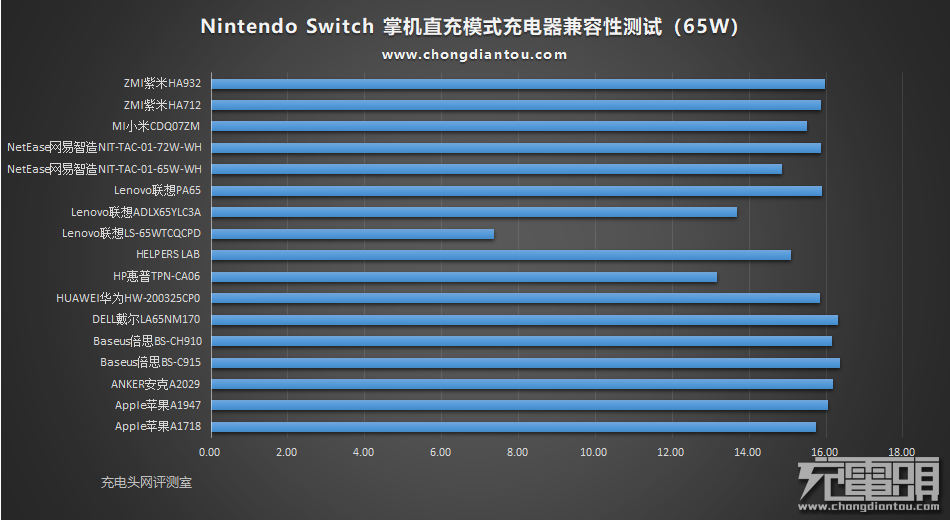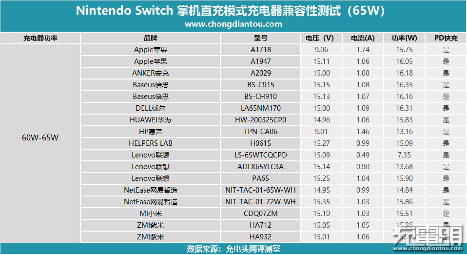 65W功率段USB PD充电器测试完毕,17款65W功率段充电器对任天堂国行Switch游戏机掌机直接充电,测试结果表明他们都能良好地兼容Switch,全部都能开启USB PD快速充电功能。