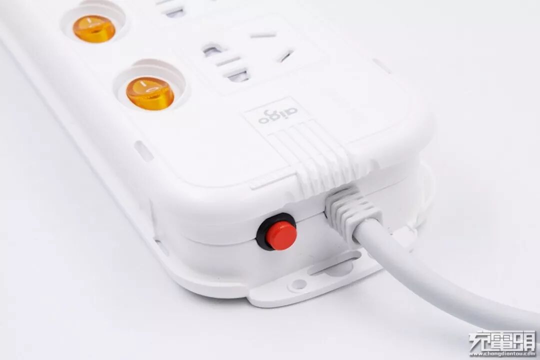 插线板的顶端电源线的一旁有个红色的小按钮,这个按钮是插线板的过载保护开关,超过2500W额定负载时会切断电力保障安全。相比传统的一次性保险丝,保险丝过载烧断后需要人手更换,既麻烦又不安全,aigo爱国者的小红点可重复使用更方便。
