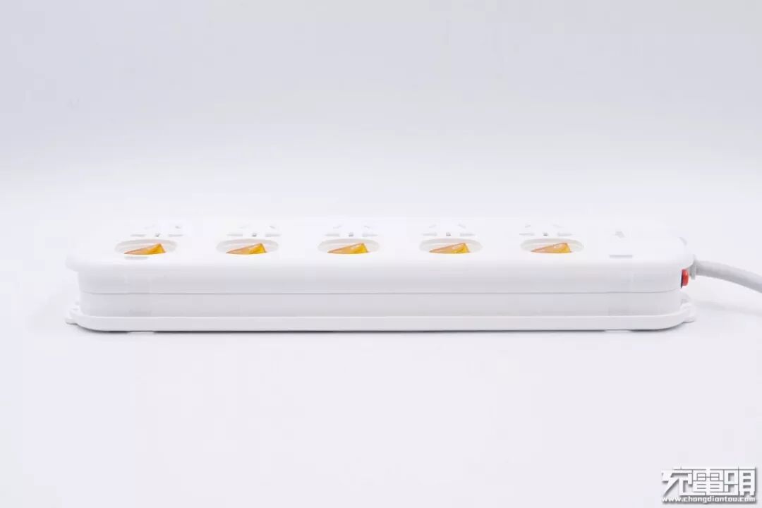 插线板外壳采用了阻燃塑料材质,白色简约凸显质感,表面磨砂工艺长久使用也较为耐脏。插线板插孔为新国标2+3插孔,一共五个,并且每个插孔都带有独立带灯开关,整个插线板最多可插入五台用电设备使用,最大功率为2500W。