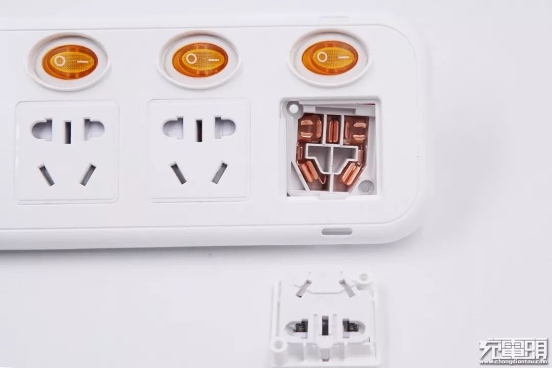 与用电器插头的接触部分使用了锡磷青铜材质制作成插套,锡磷青铜低阻值高回弹力提升导电能力的同时也能很好地夹住插入的设备插头。锡磷青铜材插套三极性分别处在不同的隔舱内,完全杜绝短路隐患。