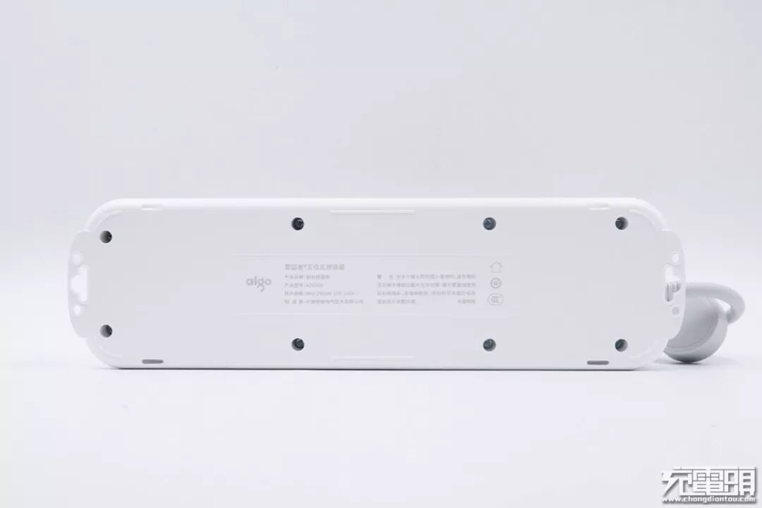 插线板的顶部设计了一个挂槽,借助墙面的钉子或是挂钩,就可以悬挂在任意高度的墙面上,方便用户使用。