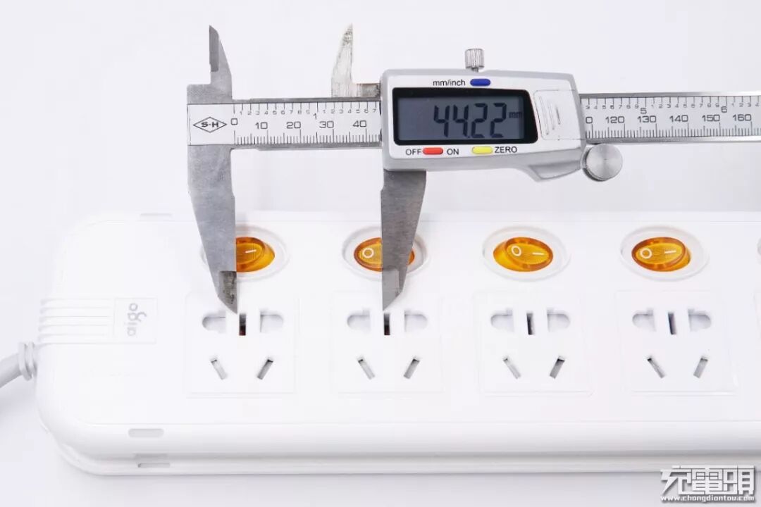 经过小编的测试可以看到,插孔孔距为44.22mm,插线板中常见孔距大约在38-41mm之间,44.22mm已经是超大孔距设计了,所以相邻的充电设备不会出现打架的情况。
