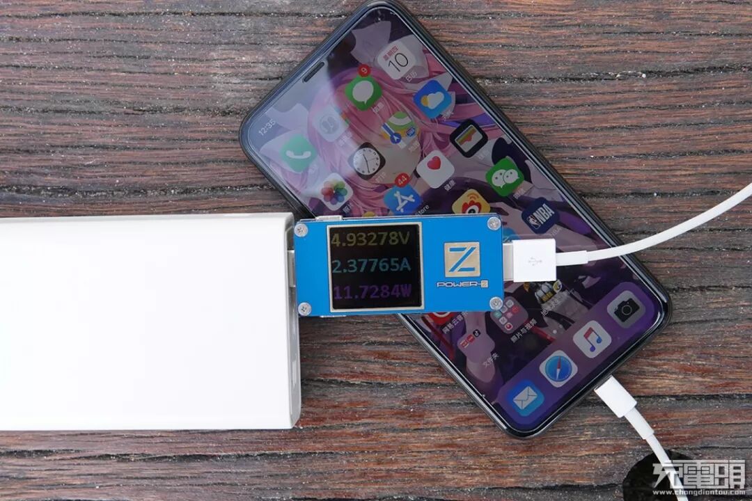 OUT2接口给iPhone XS充电,电压为4.93V,电流为2.37A,功率为11.72W,是苹果原装充电器的2倍。