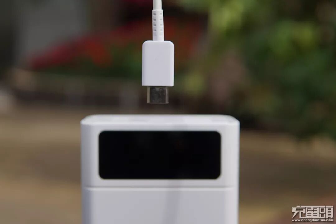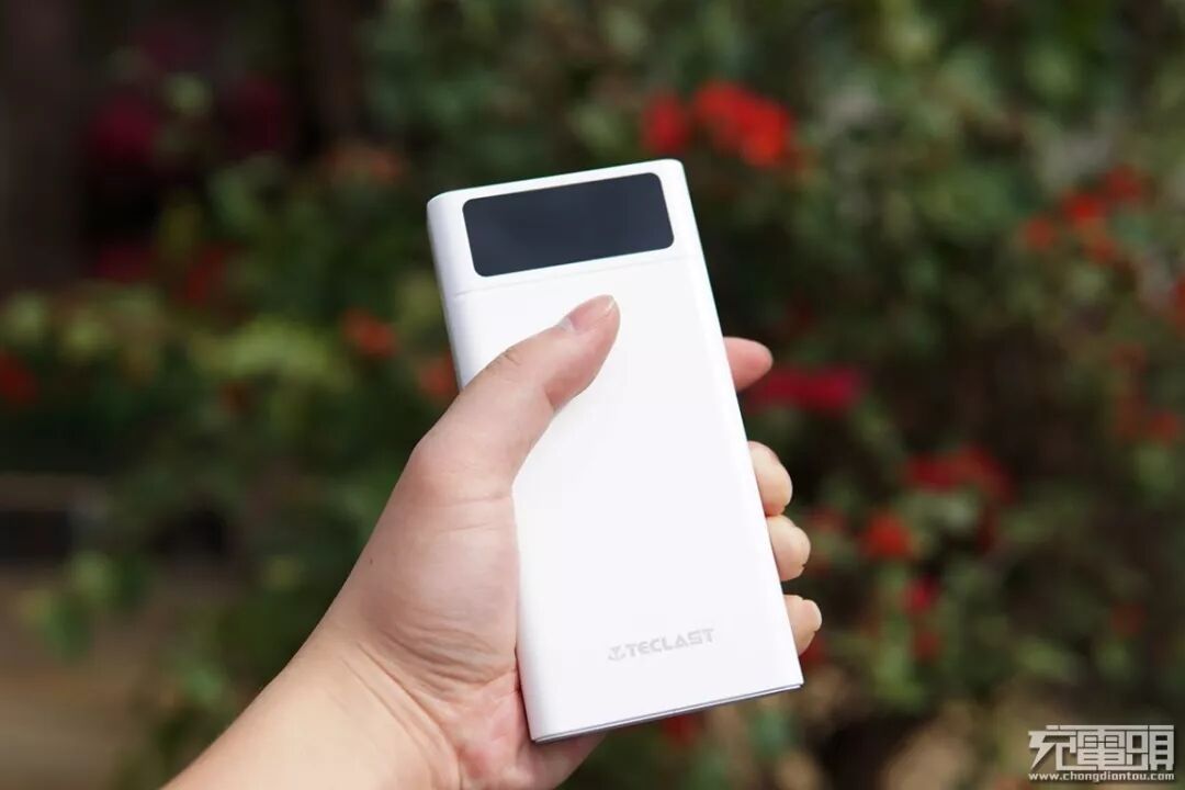 移动电源外壳为塑料材质,外观呈白色,正面是台电的英文商标。顶部黑色部分为显示屏,轻击电源开关按键可以看到红色LED数码管亮起。