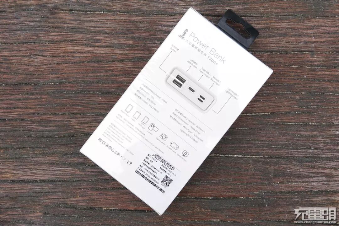 移动电源型号为T200A-W,额定容量74Wh/20000mAh,两个USB-A接口分别支持5V/1A和5V/2.1A输出。