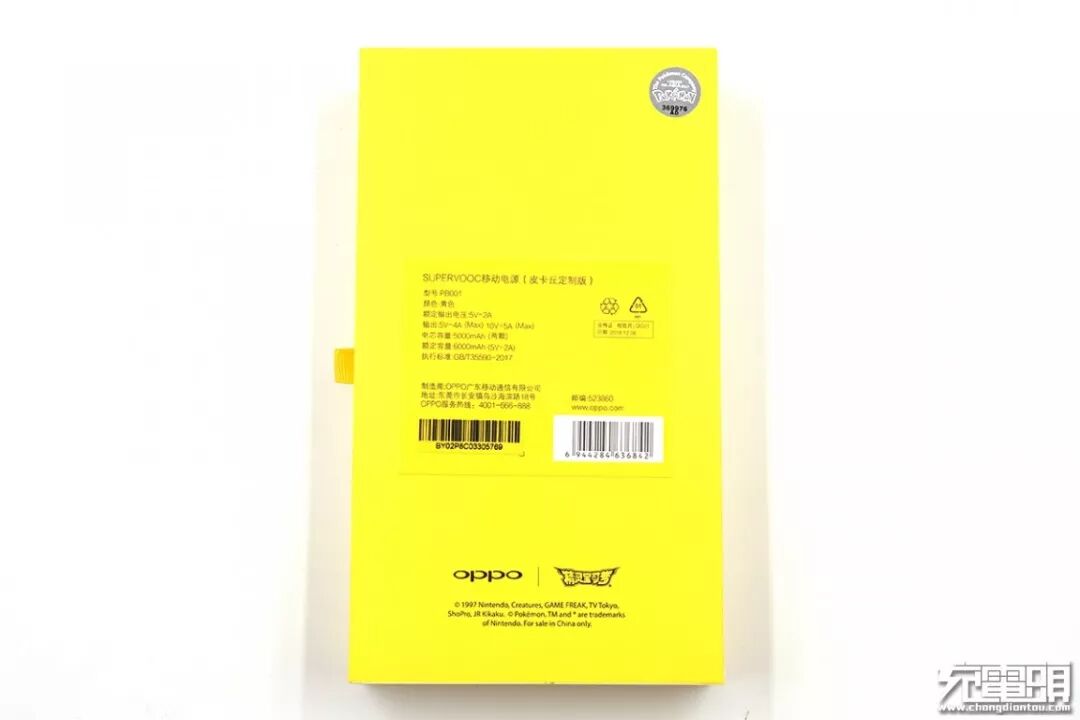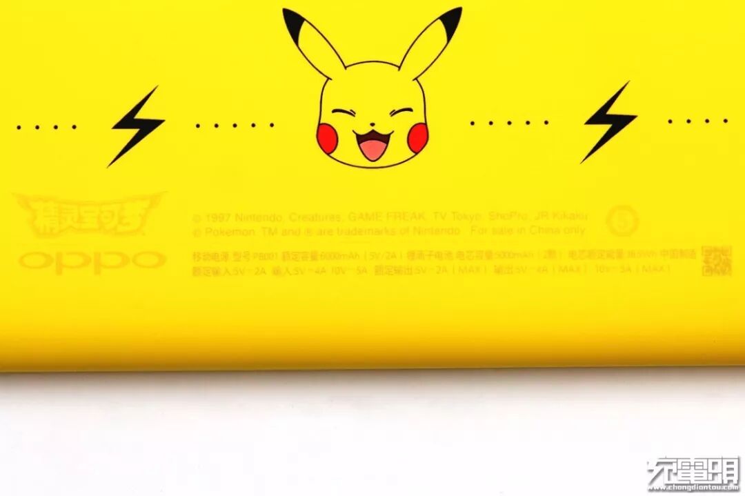 背面底部是OPPO和精灵宝可梦的品牌标志,右上角是Pokemon的授权标签,中部的铭牌标注了移动电源的容量参数等信息。