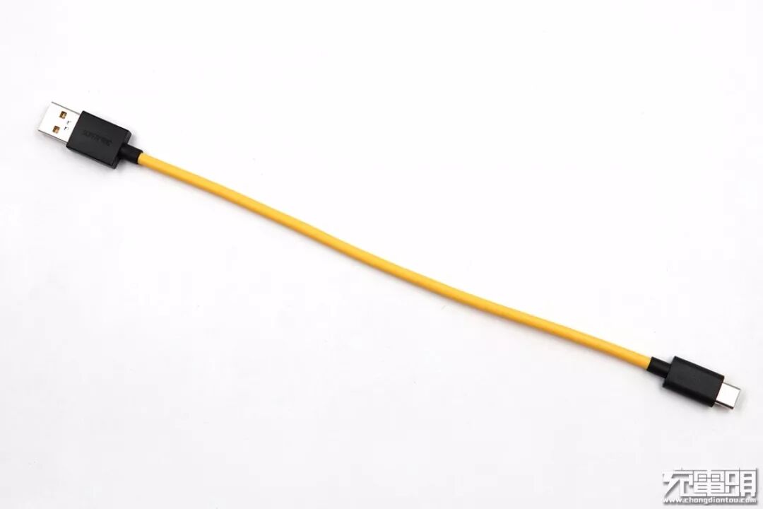 USB-A端头一面标有SUPER VOOC字样,线身为黄色,表明这条充电线与众不同。