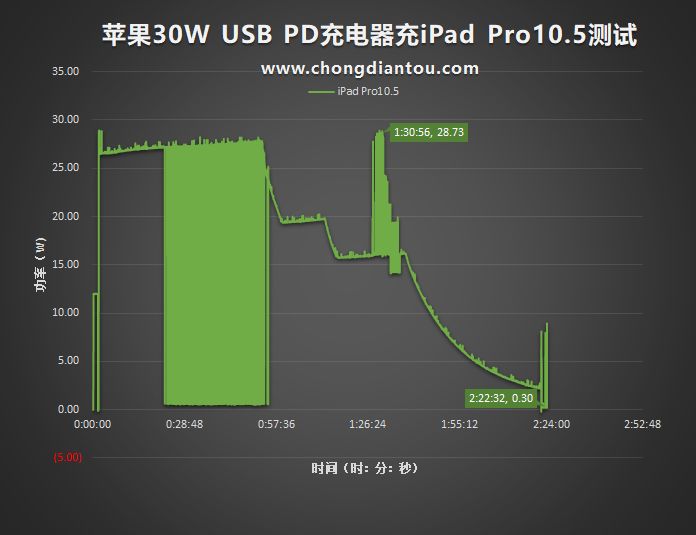 充iPad pro10.5,全程最大功率为28.73W,支持iPad Pro10.5 12V USB PD快充,充满耗时2小时22分钟。