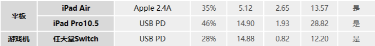 对于iPad Air老款平板可以5V/2.6A充电,而对于支持USB PD的iPad Pro10.5‘平板可以15V约30W充电,对于任天堂switch也能15V快充。