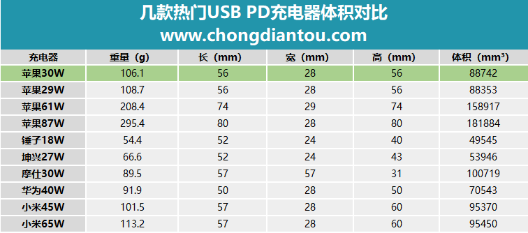 和几款热门的USB PD充电器体积对比,苹果30W处于中等位置,重量超过小米45W。